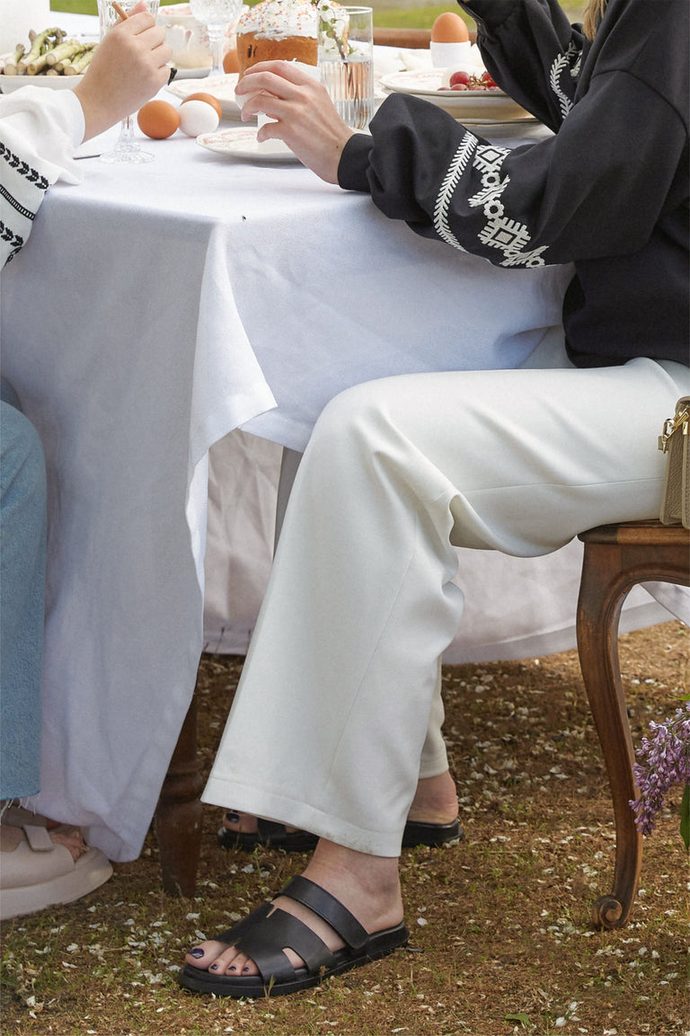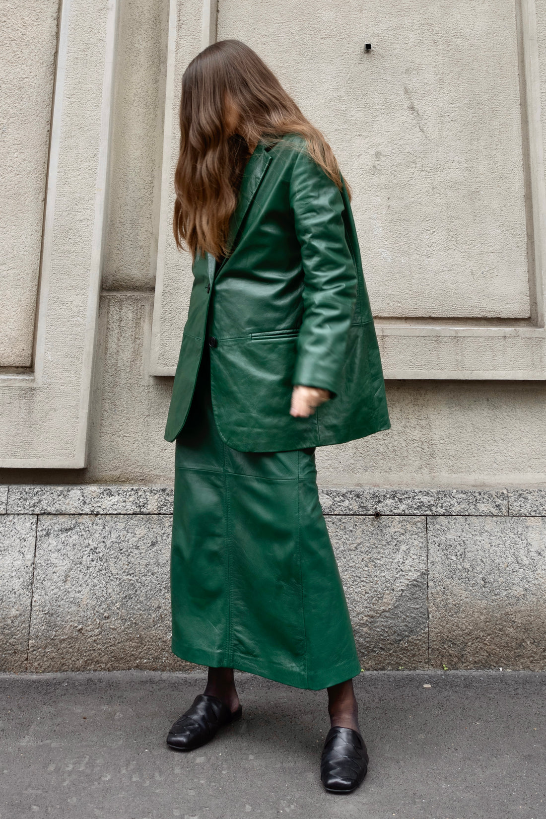 Nie tak dawno pisałam, że klapki typu mule to doskonałe rozwiązanie dla zwolenniczek spódnic. Trudno o lepsze potwierdzenie tego stwierdzenia niż look Kingi. Spódnica midi z głębokim rozcięciem cudownie koresponduje z zakończoną w kształt migdała linią palców. A oversize'owy komplet to doskonała okazja do wprowadzenia współczesnych, śmiałych rozwiązań ze świata mody do swojej garderoby.