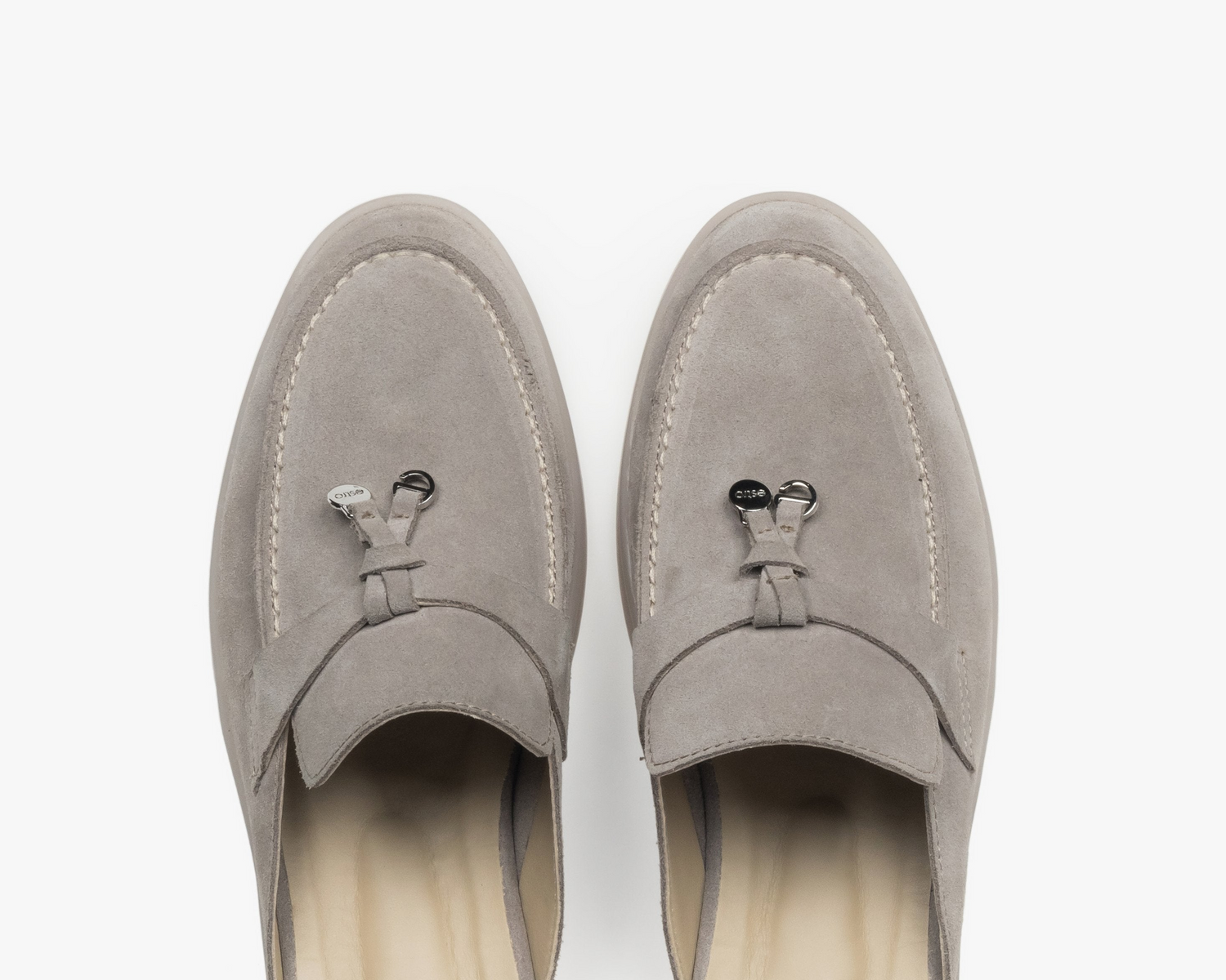 Postaw na subtelną klasykę z mulami w odcieniu gołębiej szarości, które łączą minimalistyczny design z najwyższą jakością włoskich materiałów. Miękki welur i ozdobny chwost nadają im wyjątkowego szyku, a skórzana wkładka gwarantuje stopom pełen oddech podczas letnich upałów. Te wsuwane klapki to esencja wygody w najbardziej wyrafinowanym wydaniu.