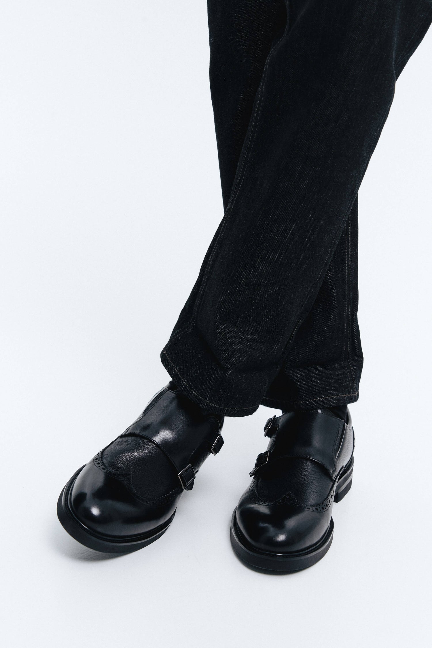 Czarne skórzane półbuty męskie typu monki z klamrami i perforacją Estro ER00116154