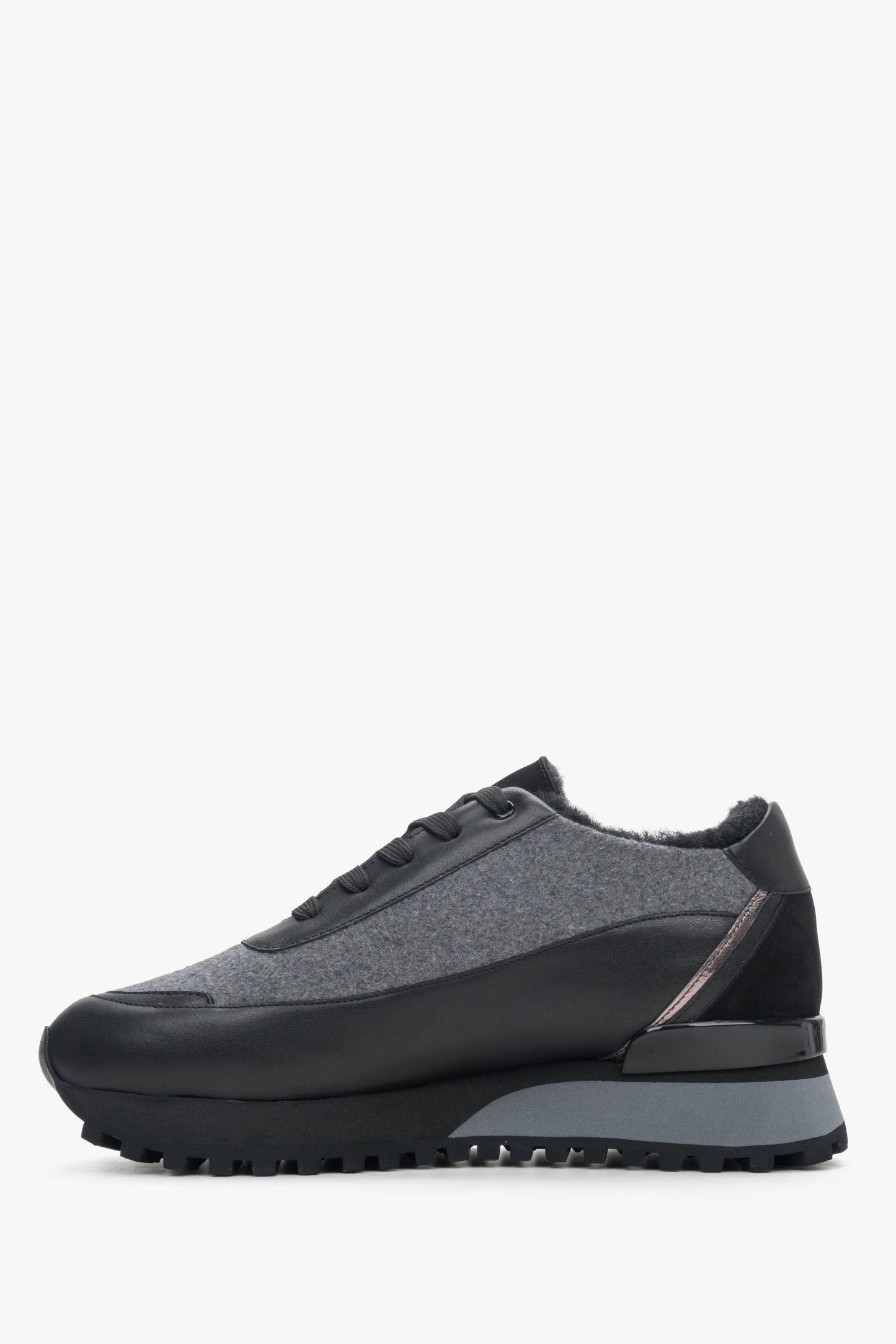 Kup czarno-szare skórzane sneakersy damskie na zimę z futrzanym wypełnieniem w naszym sklepie online. Tylko u nas obuwie, torebki i akcesoria najwyższej jakości.